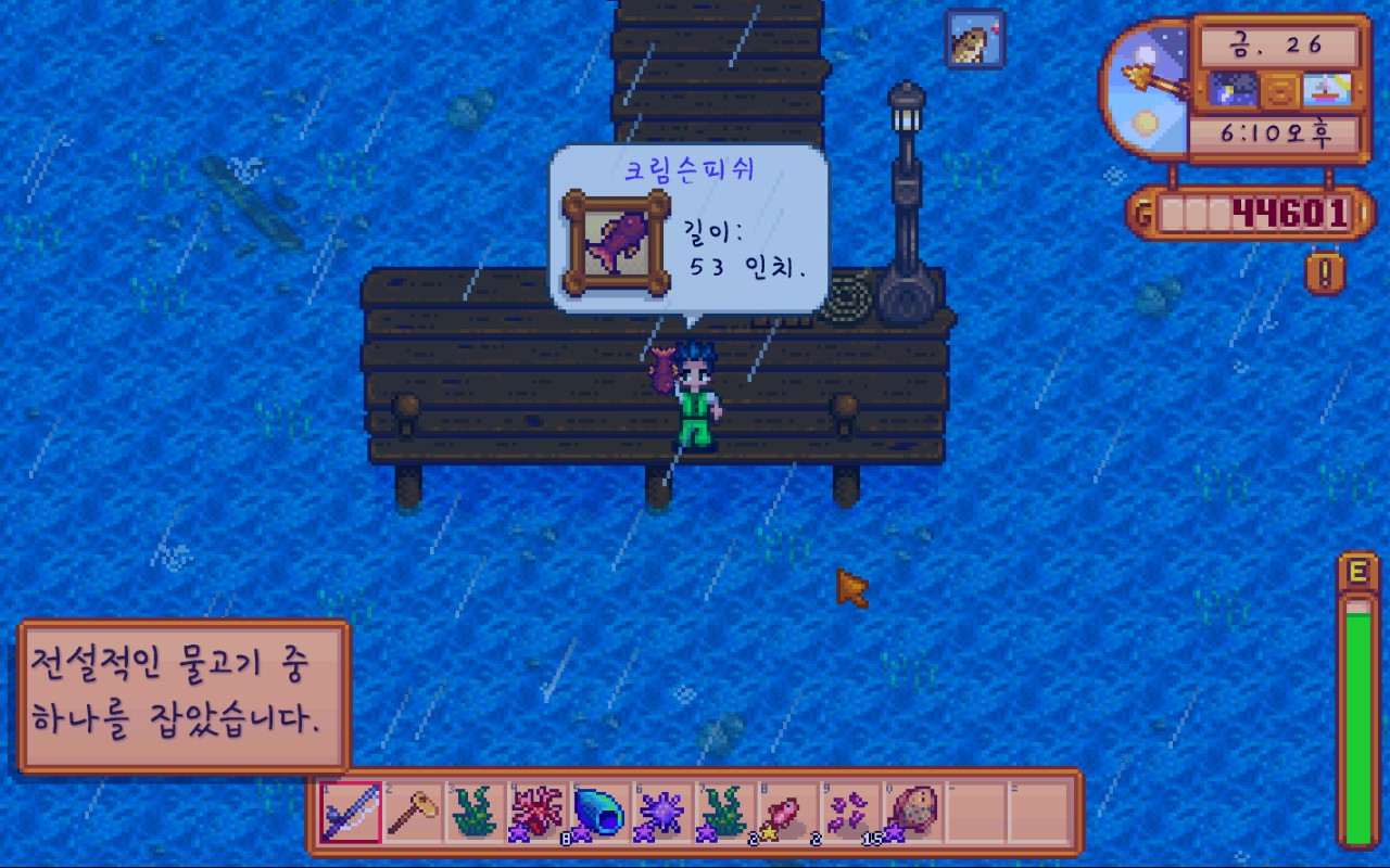 여름 가기 전에 전설 물고기를 잡아야 할거 같아서 게임 종료하기전에 급하게 잡았음
